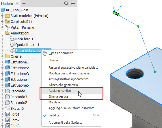 Quando si modifica un'annotazione 3DA che presenta una direttrice, è possibile fare clic con il pulsante destro del mouse e scegliere Aggiungi vertice o Elimina vertice per modificare l'aspetto della direttrice. In questa release, la posizione di questi due comandi è stata spostata nel menu contestuale.