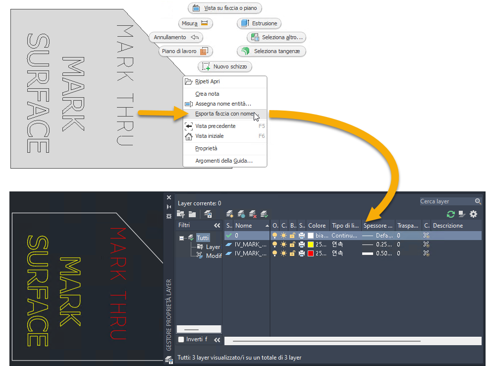 Quando si utilizza il comando Esporta faccia con nome per esportare le facce con le lavorazioni Marcatura in formato DXF, le impostazioni del layer Stile marcatura vengono mantenute nel file DXF.