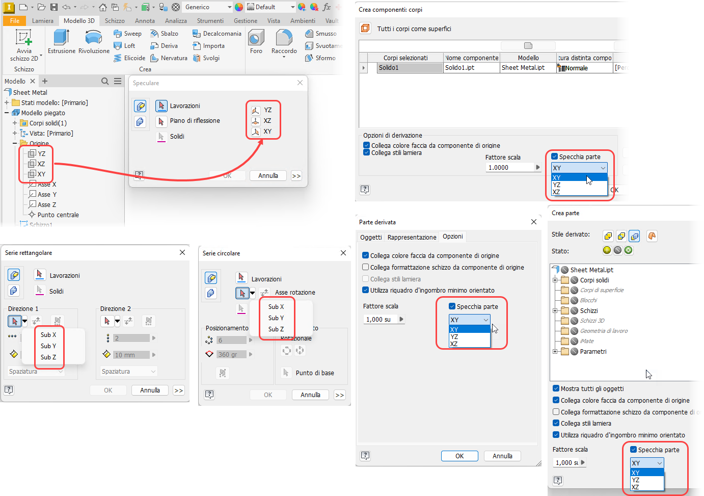 I nomi personalizzati assegnati alle geometrie di lavoro di origine vengono ora riconosciuti e compilati nelle varie finestre di dialogo, quali Specchio, Crea componenti, Crea parte, Serie rettangolare,Serie circolare e Parte derivata.