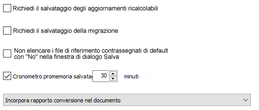 I messaggi Salva stato sostituiscono le opzioni Richiedi il salvataggio degli aggiornamenti ricalcolabili, Richiedi il salvataggio della migrazione e Non elencare nella finestra Salva i file di riferimento contrassegnati con "No".
