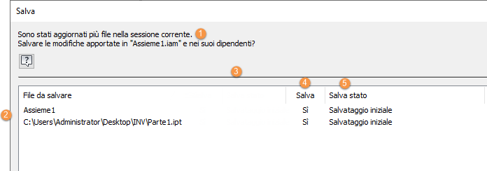 La finestra di dialogo Salvataggio degli elementi dipendenti è stata migliorata per fornire ulteriori informazioni sullo stato del file (assiemi non disponibili in Inventor LT).