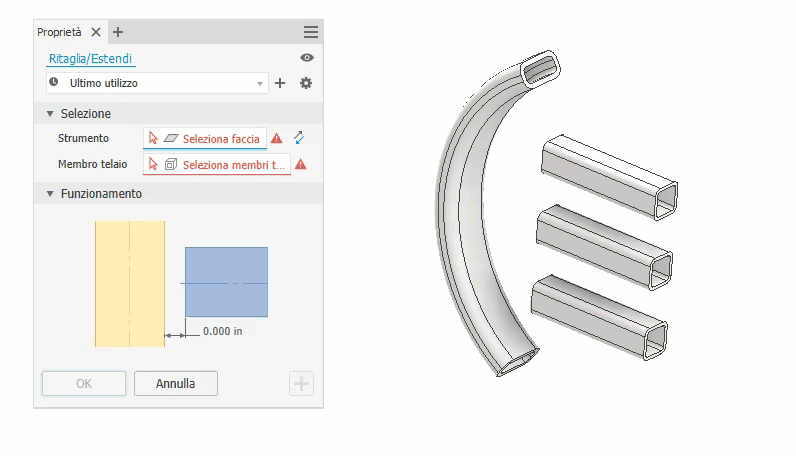 Il comando Ritaglia/Estendi supporta ora la selezione di una faccia curva per definire l'utensile.
