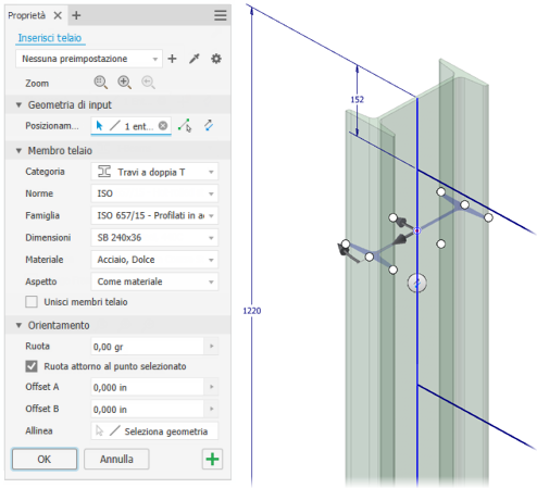 Il comando Inserisci consente ora di visualizzare l'anteprima della forma dei membri e un simbolo di origine quando si evidenzia la geometria dello schizzo. Se si sposta il cursore lungo lo schizzo di posizione, è possibile modificare la posizione dell'origine e l'orientamento del profilo prima di fare clic.