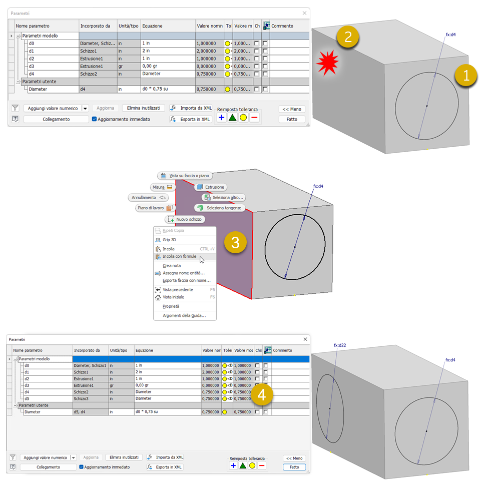 Quando si incolla uno schizzo copiato, il menu contestuale ora include l'opzione Incolla con formule. I parametri definiti dall'utente sono inclusi nell'azione Incolla. I parametri associati allo schizzo di origine vengono copiati e incollati senza essere duplicati. L'opzione Incolla con formule è supportata solo all'interno dello stesso documento, non tra documenti diversi.