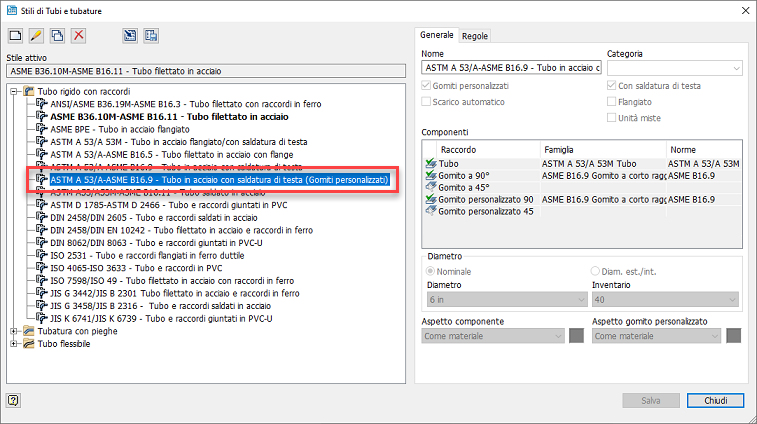Nella finestra di dialogo Stili di Tubi e tubature, sono disponibili nuovi stili che supportano l'utilizzo di gomiti personalizzati (Gomito personalizzato 45, Angolo personalizzato 90).