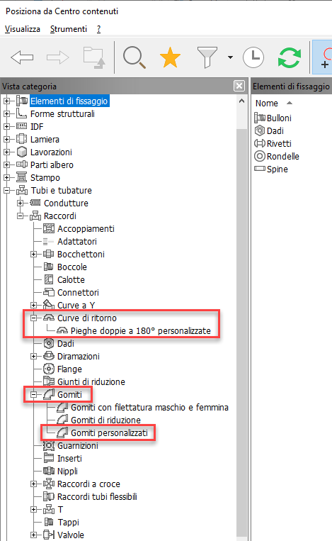 Accanto alla libreria Gomiti personalizzati, è aggiunta la libreria Pieghe doppie a 180° personalizzate. È possibile creare e pubblicare parti di entrambe le librerie.