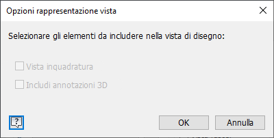 La finestra di dialogo Opzioni rappresentazione vista viene visualizzata durante la creazione o la modifica di una vista proiettata. L'opzione Vista inquadratura è disattivata per mantenere la relazione tra la vista di base e la vista proiettata.