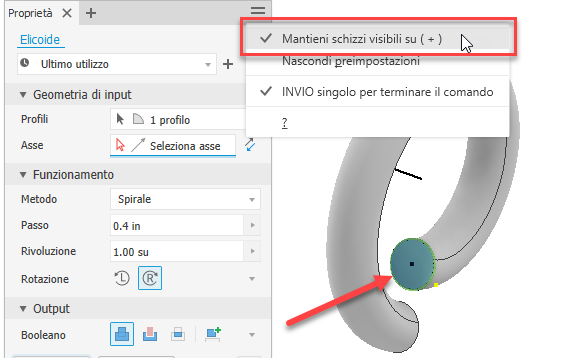 Quando si utilizza il comando Elicoide, è possibile mantenere visibile la traiettoria e lo schizzo profilo durante l'utilizzo di Applica per creare un elicoide. Nel gruppo Proprietà - Elicoide, nel menu Impostazioni avanzate, selezionare l'opzione Mantieni schizzo visibile su ( + ).