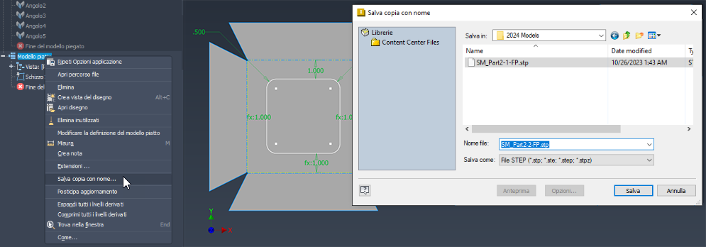 Modelli piatti in lamiera di output in formato STEP. L'output è un modello solido semplice. Gli schizzi del modello piatto possono essere inclusi nell'output e devono essere visibili per l'esportazione. Salva copia con nome è disponibile a prescindere che il modello piatto sia attivo.
