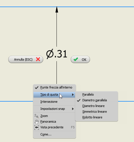Quando si seleziona lo spigolo sagoma di una lavorazione cilindrica (albero o foro), viene creato un nuovo tipo di quota, Diametro parallelo con simbolo Ø.