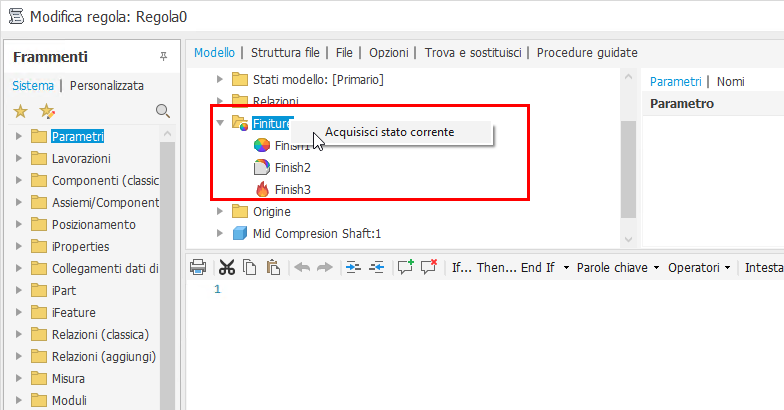 Se nel documento sono presenti finiture, il nodo Finiture del browser è disponibile nell'editor delle regole iLogic nella scheda Modello. Fare clic con il pulsante destro del mouse sul nodo e selezionare Acquisisci stato corrente per acquisire la definizione. In Assiemi, selezionare il nodo Finiture per acquisire tutte le definizioni.