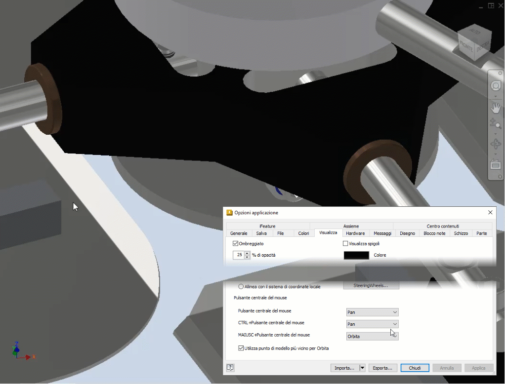 È stata aggiunta una nuova opzione applicazione per controllare se il punto perno viene utilizzato quando si esegue l'orbita del modello nell'area di disegno. Se questa opzione è deselezionata, viene utilizzato il funzionamento dell'orbita esistente.
