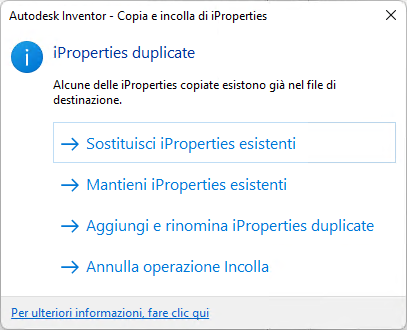Quando si incollano le proprietà in un altro documento, se esistono duplicati, viene richiesto di specificare l'azione da eseguire: