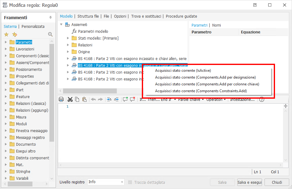 Fare clic con il pulsante destro del mouse su un componente del Centro contenuti nell'Editor delle regole per visualizzare e utilizzare l'opzione "Acquisisci stato corrente (Components.Add by Designation)" appena aggiunta. Questa opzione è disponibile solo negli assiemi.