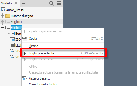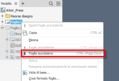 Nelle versioni precedenti di Inventor, era necessario fare doppio clic sul foglio per attivarlo. Ora è possibile sfogliare diversi fogli di un disegno utilizzando i comandi Foglio successivo o Foglio precedente a partire dal foglio selezionato. Se lo si desidera, è possibile assegnare tasti di scelta rapida a questi comandi.