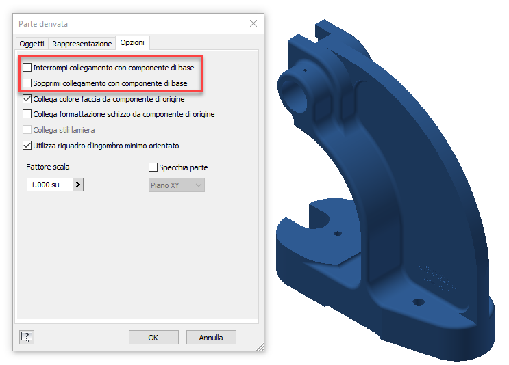 Inoltre, durante la creazione di parti o assiemi derivati, è possibile scegliere di sopprimere o interrompere il collegamento tra il componente di base e la parte o l'assieme derivati utilizzando le nuove caselle di controllo.