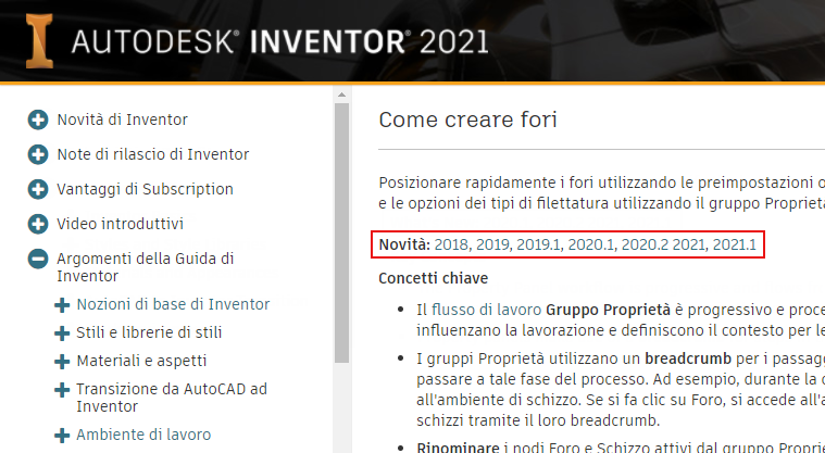 Inoltre, quando si utilizza F1 per accedere ad una pagina della Guida, ove applicabile, nella parte superiore della pagina vengono visualizzati i collegamenti all'argomento Novità che descrive le modifiche alla lavorazione o al comando.