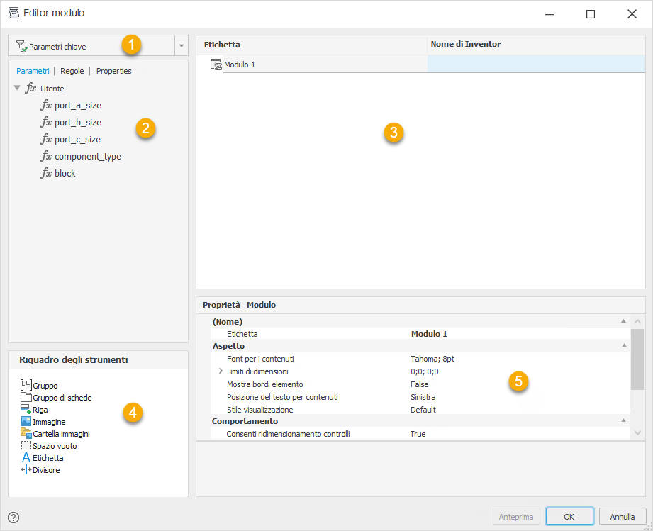 Definisce le proprietà per l'elemento evidenziato nella struttura di progetto del modulo. Le proprietà variano a seconda dell'elemento selezionato.
