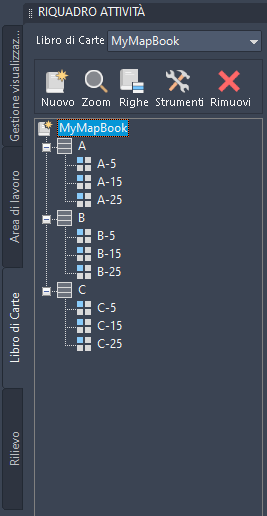 Quando si genera il libro di Carte, i tasselli vengono elencati nel riquadro Attività e viene visualizzata una scheda di layout per ogni tassello.