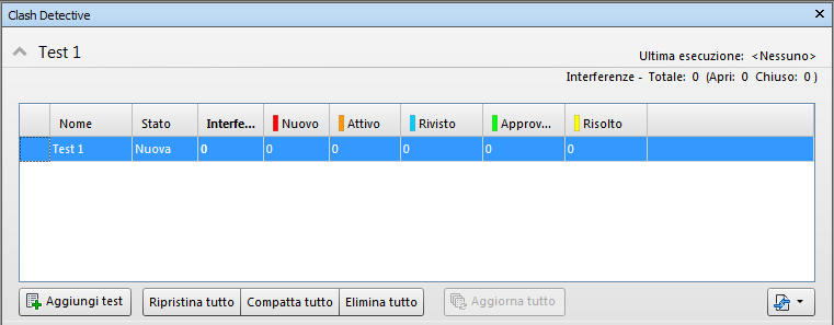 Il gruppo espandibile Test, accessibile da tutte le schede della finestra agganciabile Clash Detective, contiene informazioni di riepilogo per ogni test di interferenza visualizzato. Viene visualizzato il numero totale di interferenze in ogni test insieme al numero di interferenze per ogni stato interferenza identificato.