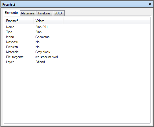 Per default, le proprietà dei file interne, come quelle di trasformazione e della geometria, non sono visualizzate. Quando le proprietà interne del file sono attivate, la proprietà Tipo interno viene visualizzata nella scheda Elemento. I nomi delle proprietà interne sono nascosti di default. Quando l'opzione è attivata, vengono visualizzati tra parentesi nella colonna Proprietà e in ogni scheda della finestra Proprietà. Può essere utile visualizzare queste funzionalità quando si esegue la mappatura delle proprietà di Quantification oppure quando si modifica manualmente un file XML di mappatura delle proprietà. Entrambe le funzionalità vengono attivate utilizzando l'Editor delle opzioni.