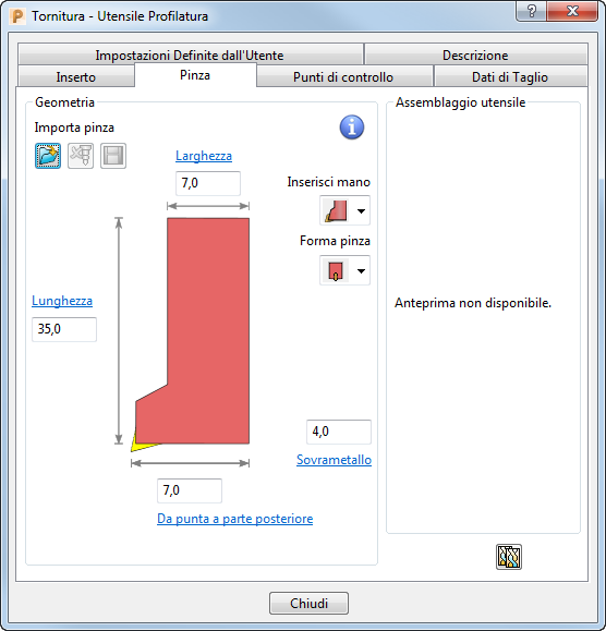 La scheda Pinza della finestra di dialogo Utensile definisce la porzione della pinza dell'utensile. I percorsi utensile evitano il contatto con la Pinza utensile.