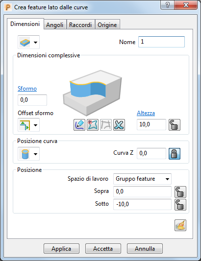 Curva Z — Inserire un valore per specificare l'altezza della curva di profilo lungo l'asse Z. Se si ha un angolo di sformo specificato, si applica eseguendo l'offset della curva da questa altezza.