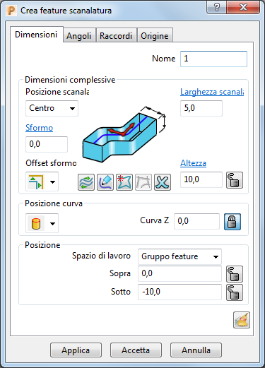 Sotto: la curva di profilatura viene impostata nella parte inferiore della feature.Curva Z: immettere un valore per specificare l'altezza della curva di profilatura lungo l'asse Z. Se si specifica un angolo di sformo, questo viene applicato eseguendo l'offset della curva da questa altezza.