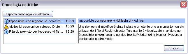 Nel riquadro Notifiche di Worksharing Monitor vengono elencate solo le notifiche attive, ovvero i problemi non ancora risolti. Quando un problema viene risolto, la relativa notifica viene spostata nella cronologia delle notifiche.