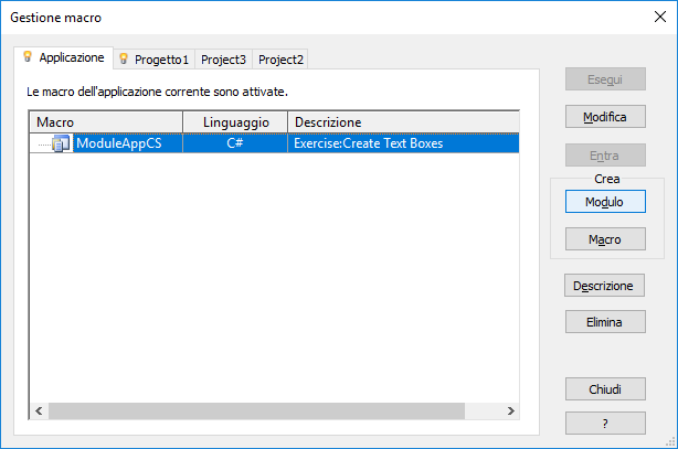 - Selezionare la scheda Applicazione per le macro a livello di applicazione o la scheda relativa al progetto per le macro a livello di documento.