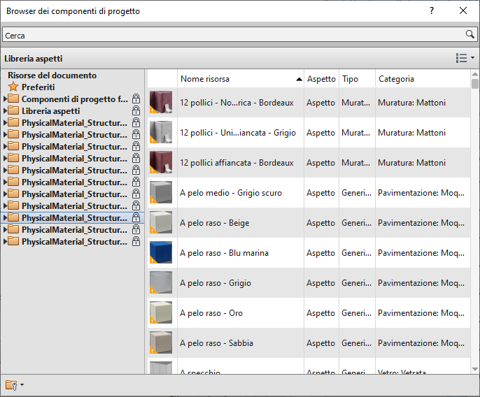 Suggerimento: Utilizzare nuovi componenti di aspetto (senza l'icona ) per i materiali. Ciò garantisce che le viste e le immagini di rendering utilizzino le rappresentazioni di materiali più aggiornate e della massima qualità.