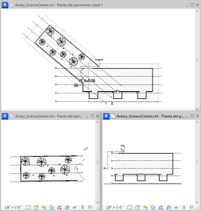 Nella parte superiore dell'illustrazione seguente vengono visualizzati i riquadri di definizione che circondano l'edificio principale e l'aviario. Il riquadro di definizione 1 è stato applicato alle linee di griglia dell'edificio principale, mentre il riquadro di definizione 2 è stato applicato alle linee di griglia dell'aviario. Di conseguenza, nelle viste dipendenti (parte inferiore dell'illustrazione) vengono visualizzate solo le linee di griglia appartenenti a ciascuna parte dell'edificio.