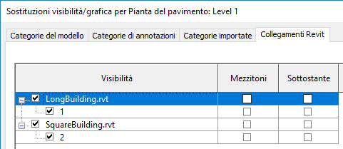 I parametri che controllano la visibilità e gli elementi grafici dei modelli Revit collegati sono raggruppati nella scheda Collegamenti Revit della finestra di dialogo Visibilità/Grafica.