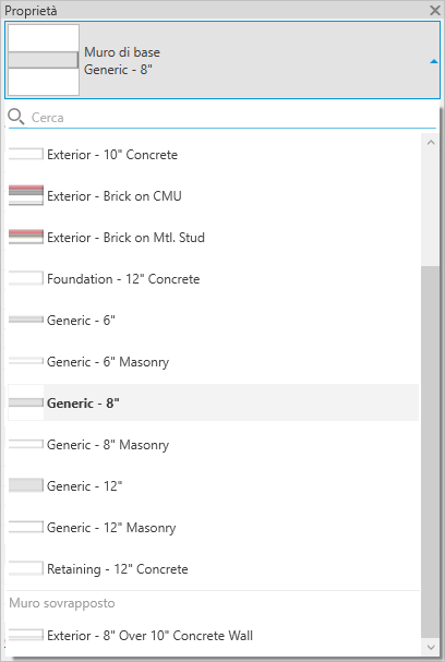 Quando uno strumento per l'inserimento di elementi è attivo, o elementi dello stesso tipo sono selezionati nell'area di disegno, il Selettore di tipo viene visualizzato nella parte superiore della tavolozza Proprietà.