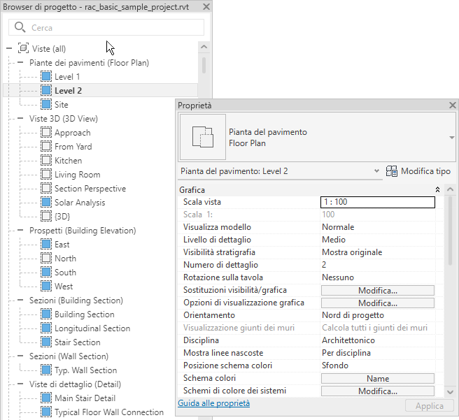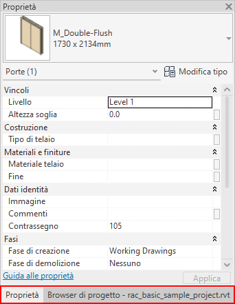 Nella seguente immagine, il Browser di progetto e la tavolozza Proprietà sono stati raggruppati. Notare che la tavolozza Proprietà è la scheda attiva.