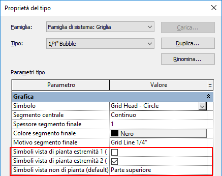 Eseguire questa operazione manualmente in una vista per singole linee di griglia, oppure per tutte le linee di griglia di un determinato tipo mediante la modifica delle proprietà del tipo.