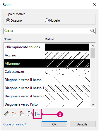 Nella finestra di dialogo Retini, a cui si accede dalla scheda Gestisci, selezionare uno o più motivi da esportare in un file PAT