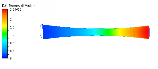 Nota Come previsto, il flusso si avvicina alla velocità sonica alla strozzatura e accelera a circa 2,5 all'uscita.
