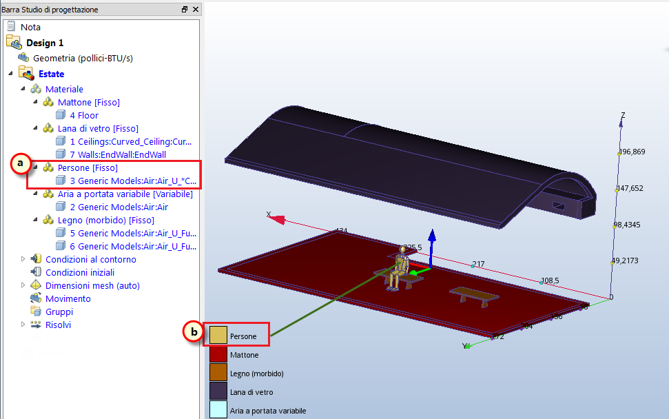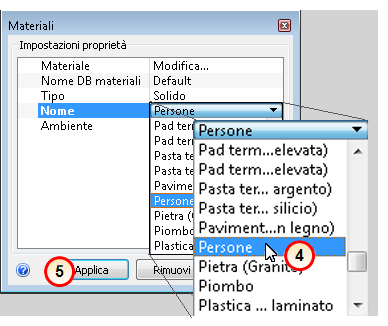 In questa fase all'occupante verrà assegnato un materiale in grado di simulare le proprietà termiche e fisiche di un corpo umano. Il database materiali installato di default non contiene un materiale "corpo umano". Pertanto, verrà utilizzato il silicone, un materiale molto simile. Un approccio più rigoroso richiederebbe la creazione di un materiale dotato delle reali proprietà del corpo umano da aggiungere a un database materiali personalizzato.