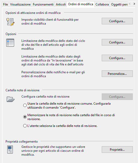 Nella finestra di dialogo Impostazioni del Vault, scheda Ordini di modifica, è possibile configurare il funzionamento degli ordini di modifica.