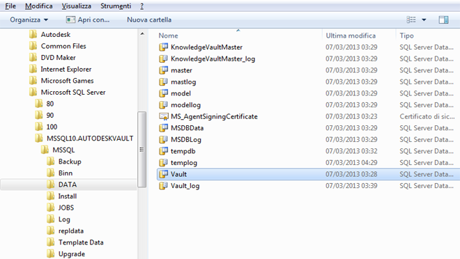 Quando si installa Autodesk Vault Server, viene creato un unico Vault denominato Vault. I file di database per il Vault vengono creati nella cartella MSSQL$AUTODESKVAULT\Data, contenuta nella cartella di installazione di Microsoft SQL Server.