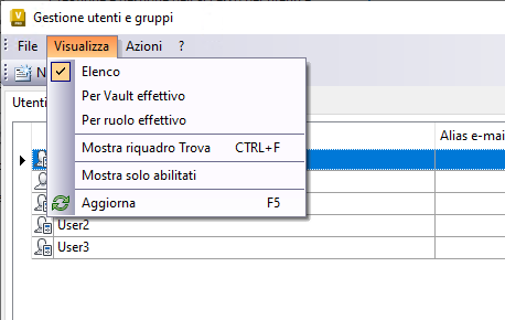Visualizzare i profili utente in un elenco non strutturato, un elenco raggruppato in base ai Vault effettivi a cui l'utente può accedere o un elenco raggruppato in base ai ruoli effettivi.