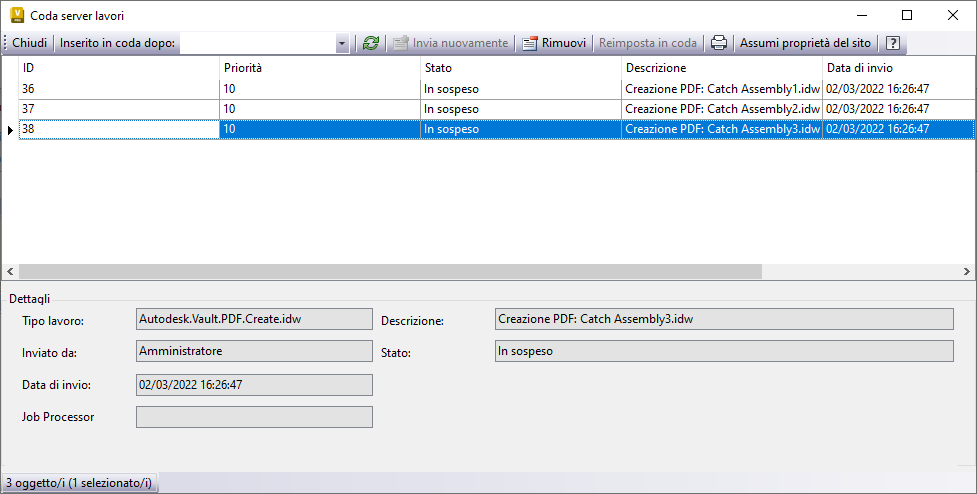 La coda del server lavori consiste di un elenco, o coda, dei lavori inviati dai client (Inventor, AutoCAD, Vault e Autoloader) in attesa di elaborazione. Tale coda viene memorizzata e gestita da Vault Server.