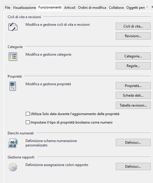 La scheda Funzionamenti nella finestra di dialogo Impostazioni del Vault include opzioni per la modifica delle definizioni del ciclo di vita e la gestione delle revisioni, l'amministrazione di categorie e regole, la creazione e la modifica di proprietà, la definizione di schemi di numerazione personalizzati e l'assegnazione di colori nei rapporti.