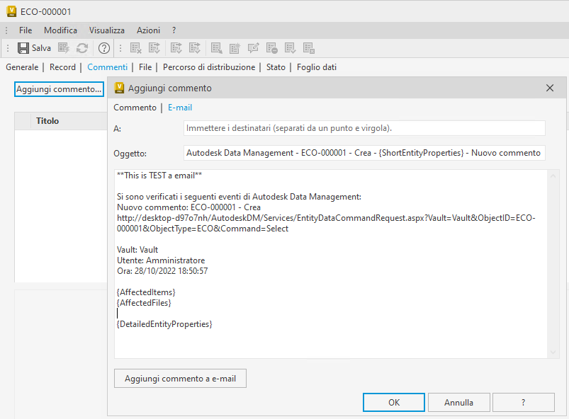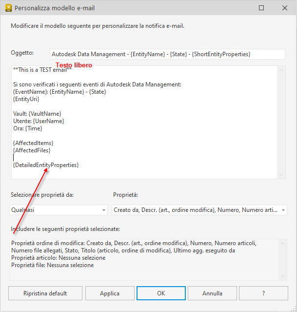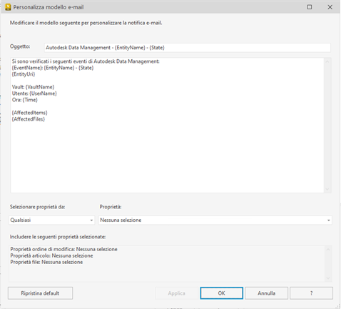 Di seguito è riportata la vista di default del modello di notifica via e-mail dell'ordine di modifica che verrà visualizzato in Impostazioni Vault prima di selezionare le proprietà.
