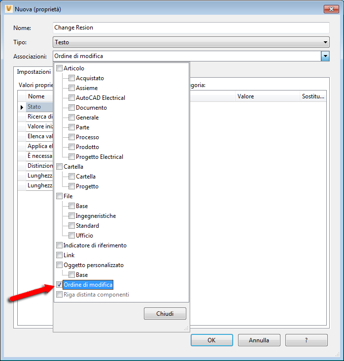 Nella finestra di dialogo Definizioni di proprietà è possibile creare le proprietà definite dall'utente per gli ordini di modifica.