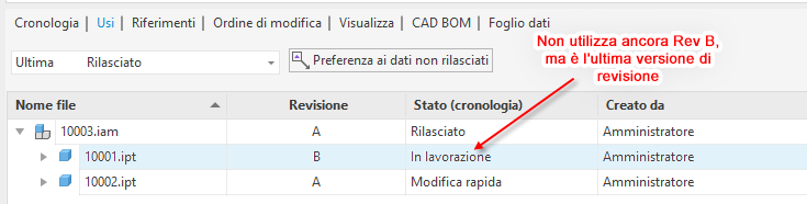 , nella scheda Usi viene visualizzata la versione più recente del file. Mostra la fase corrente di tutti i componenti/sottocomponenti.
