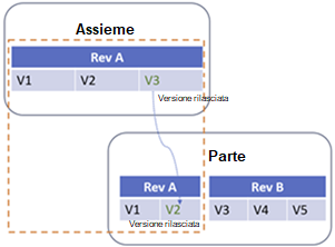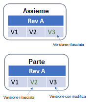 Ecco un esempio in cui abbiamo un assieme e una parte entrambi in revisione A.