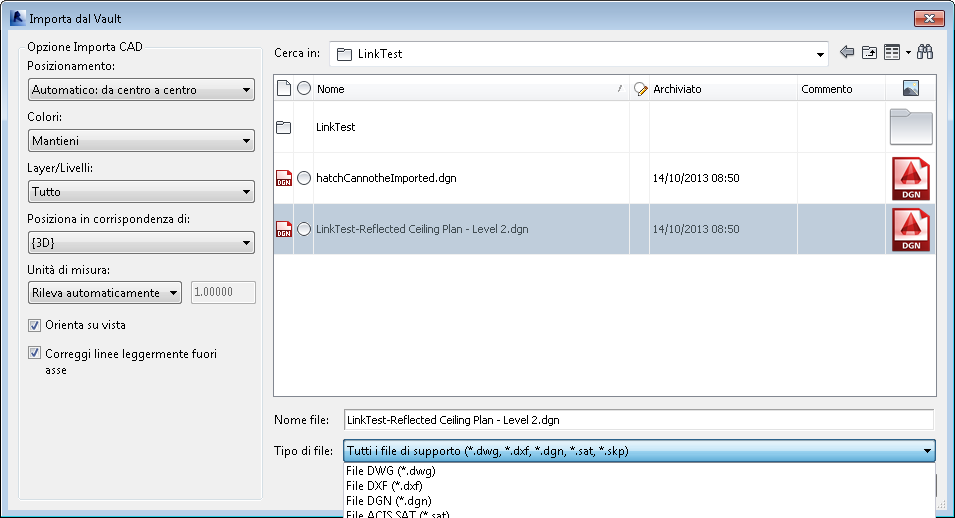 Quando si importa un file nel progetto Revit corrente, è possibile selezionare una preferenza di posizionamento.