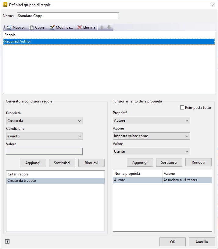 Le regole vengono create, modificate ed eliminate nella finestra di dialogo Definisci gruppo di regole.